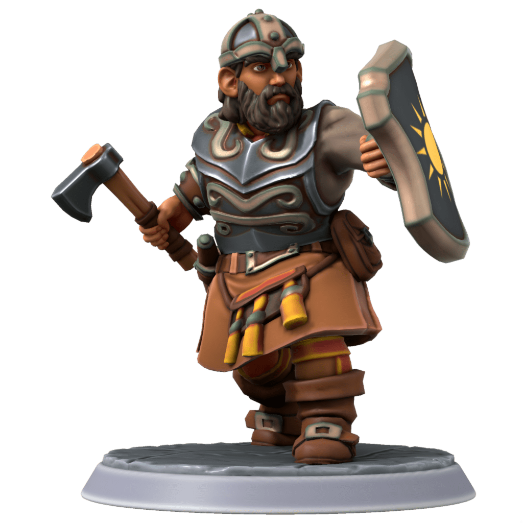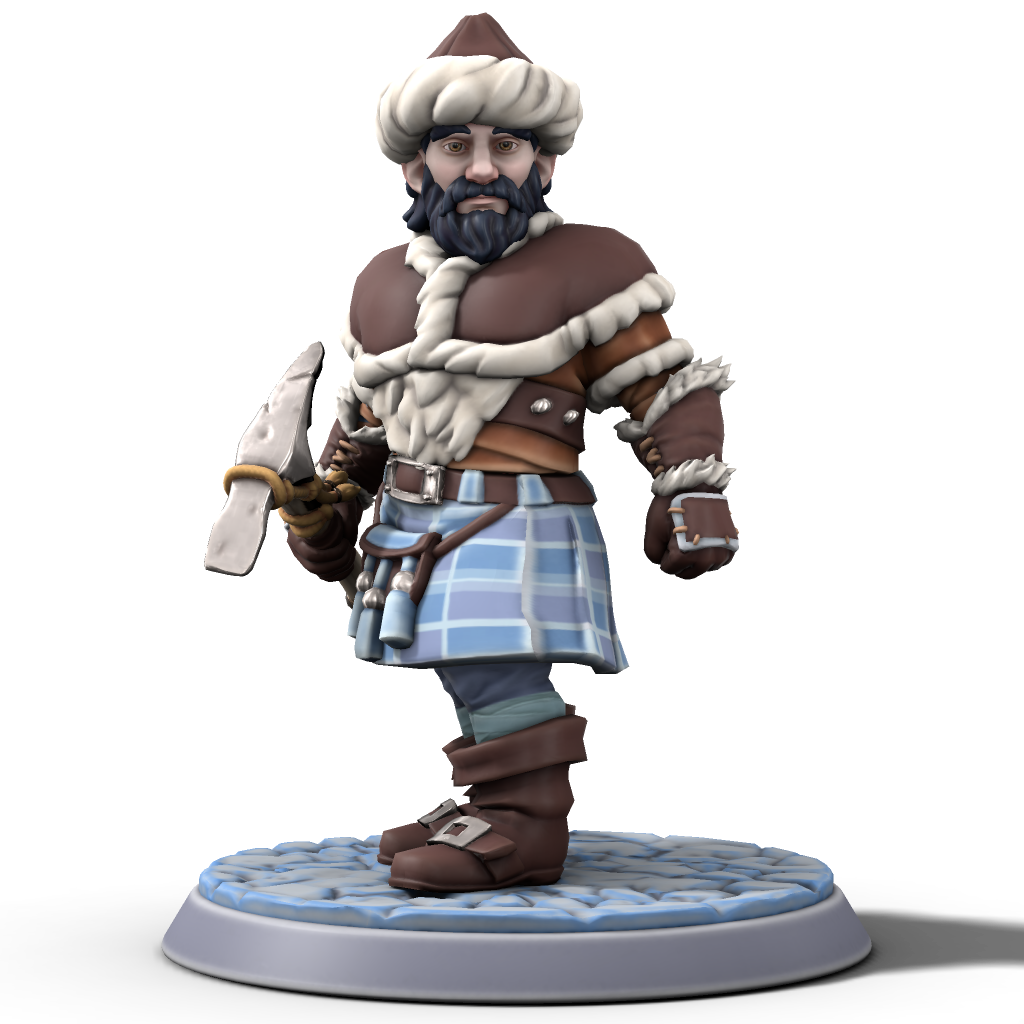 The dwarves of the Forgecrown clan typically have light complexions, with jet black hair and gray eyes. They wear a kilt with a simple black and white tartan. The clan prefers to use black-and-white onyx gemstones in their jewelry. Since this clan is the ruling clan of the Great Underground Jarldom of Dwyrheim, the colors black and white by themselves are often considered to be reserved for use by the jarl’s clan and jarldom’s officials. Their home is also the capital of Dwyrheim: Bergburg.