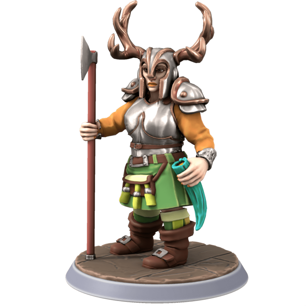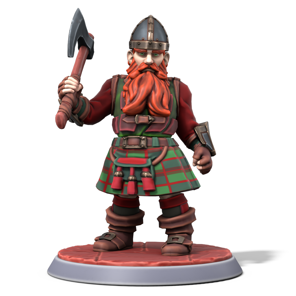 The dwarves of the Bloodaxe clan typically have ruddy complexions, with fiery red hair and bright green eyes. They wear a kilt with a simple red and green tartan. The clan prefers to use bloodstone gemstones in their jewelry, and many favor axes as a personal weapon. Based out of the dwelve of Bludburg, the Bloodaxe clan is renowned for being the fiercest warriors of Dwyrheim, and they are known to focus heavily on concepts of order, legality, tradition, and honor (to the degree of being a detriment, in some instances). These attitudes naturally lead the Bloodaxe clan to often clash with others, especially members of the Bluestone clan.