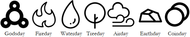 | Godsday | Fireday | Waterday | Treeday | Airday | Earthday | Coinday |