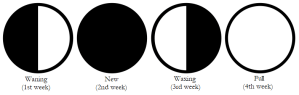 - A first quarter moon appears on the 15th of each month.